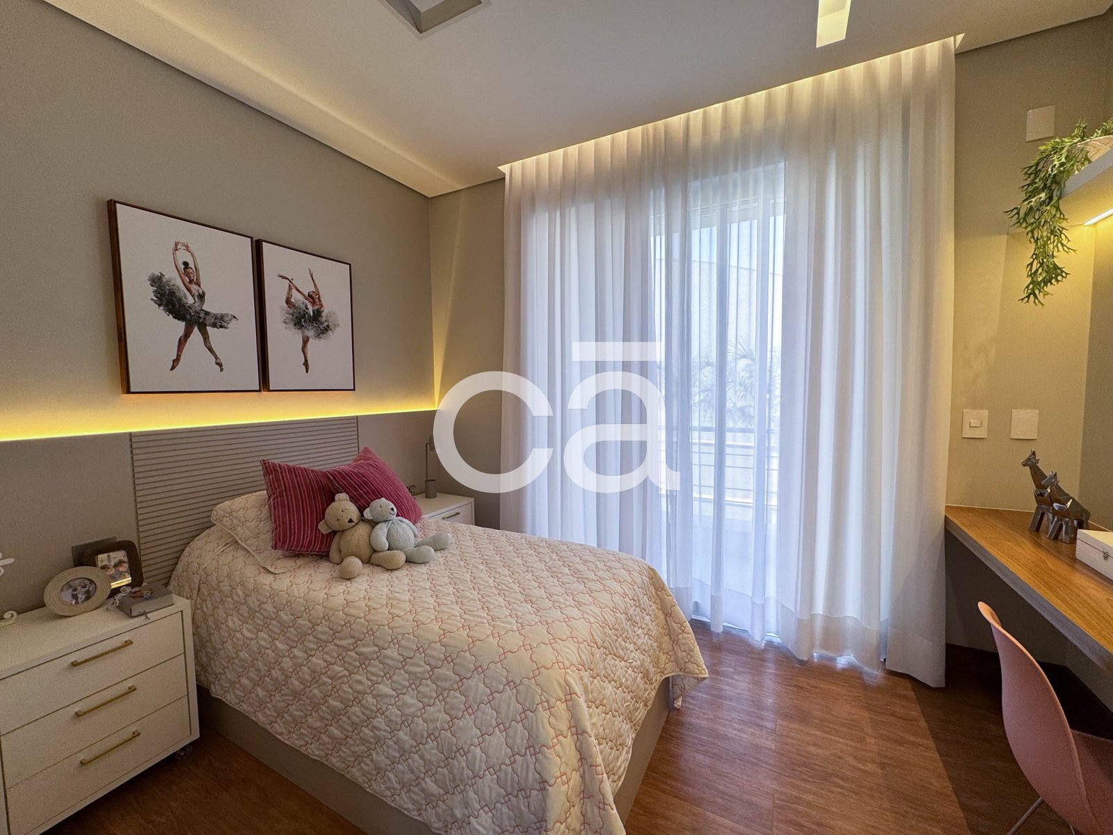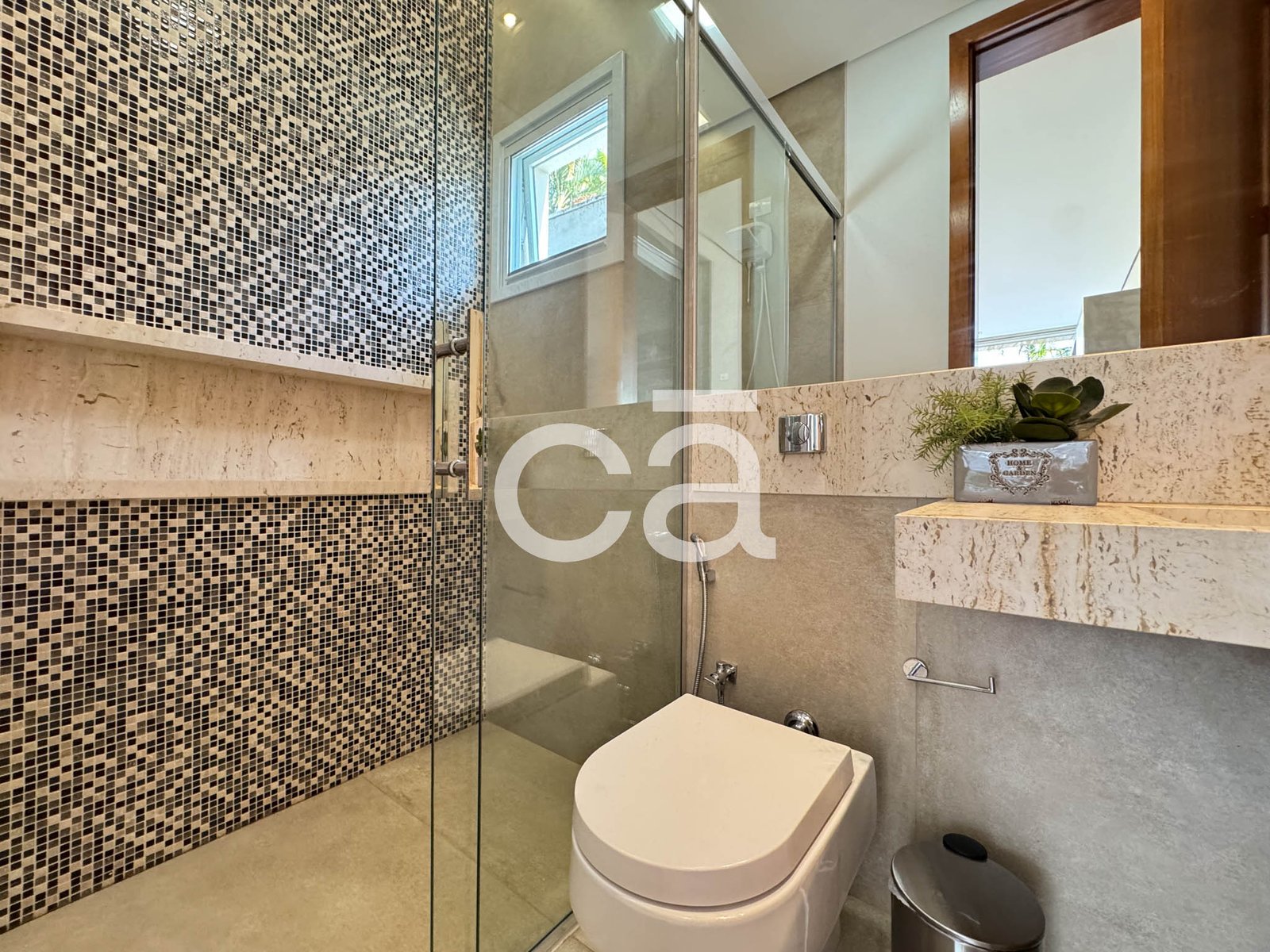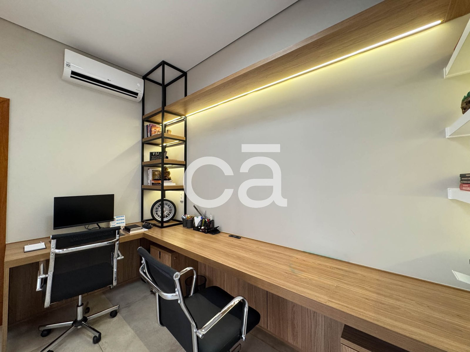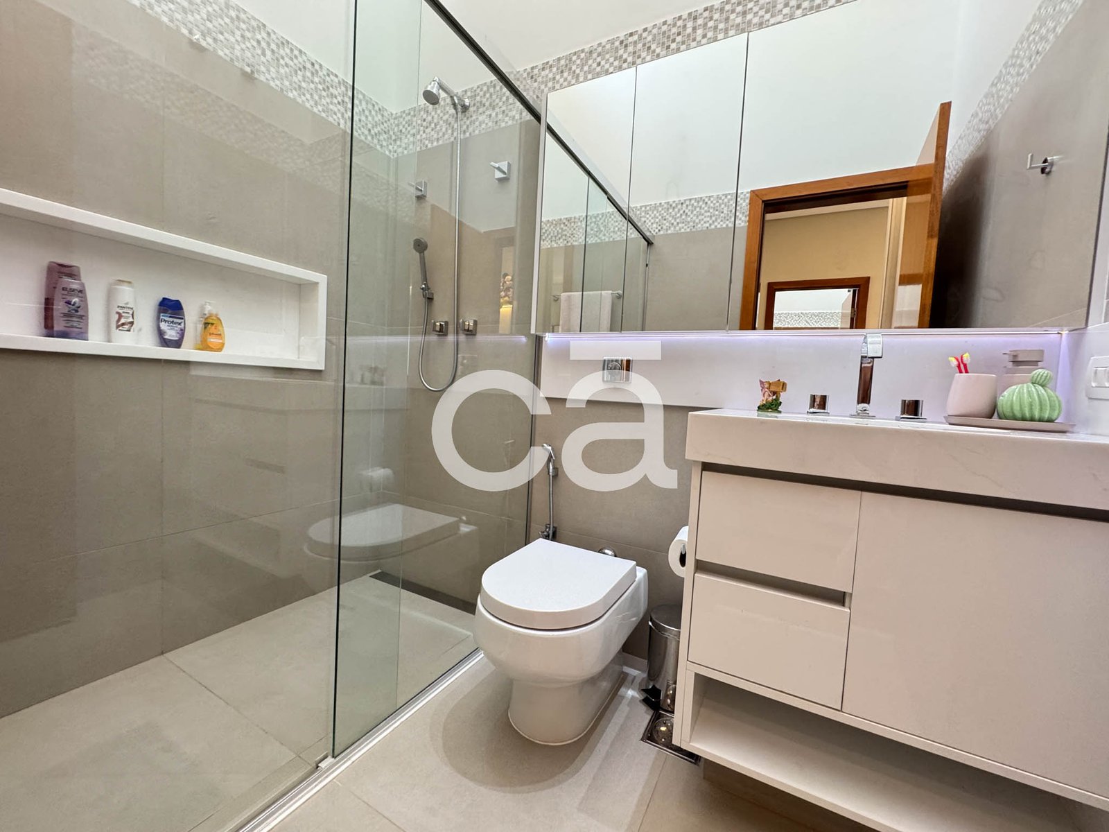 Tem 4 suítes no andar superior, sala de TV e copa e lavanderia de apoio. A suíte master possui isolamento acústico e closet. No térreo possui um escritório que pode ser convertido em uma quinta suíte.